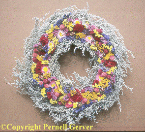 This colorful large wreath has a base of artemisia 'Silver King' dressed with celosia, yarrow, tansy, acroclinium, globe amaranth, annual statice, larkspur, and love-in-a-mist. The artemisia base is very aromatic - $45