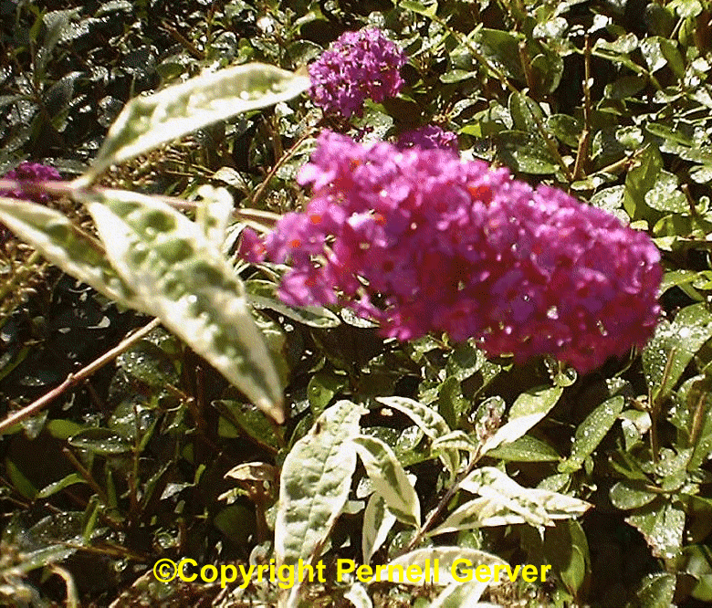 'Harlequin': 6-8', Bright-violet flowers are borne at the tips