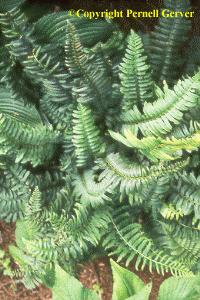 Polystichum - Christmas Fern (part shade to shade)acrostichoides: 12-18", One of the most attractive evergreen ferns, Christmas fern was given its common name because its foliage is still green at Christmastime. It is an attractive plant and its fronds have the classic "fern" shape. It has medium-to-deep-green fronds. Newer fronds are bright green that eventually change to deep green as they mature. The fronds have a glossy sheen and a thick, leathery appearance and feel. The center stalk of each fern is brownish green and has a scaly coating. The fronds stand upright in the center of the clump, but tend to bend outward around the outer edges of the clump. Each frond is wider in the middle than at either end. The fronds grow 12 to 18 inches tall. Christmas fern reproduces by spores. These spores are carried in rows on the undersides of its fronds. Christmas fern is a small- to medium-sized plant. It forms a tidy clump about a foot wide or so. It combines nicely with other shade-loving plants and it's very easy to grow. All it needs is a shady spot in the garden. A live plant in a 3" pot - $15 each or 3 for $42.75 - You save $2.25!