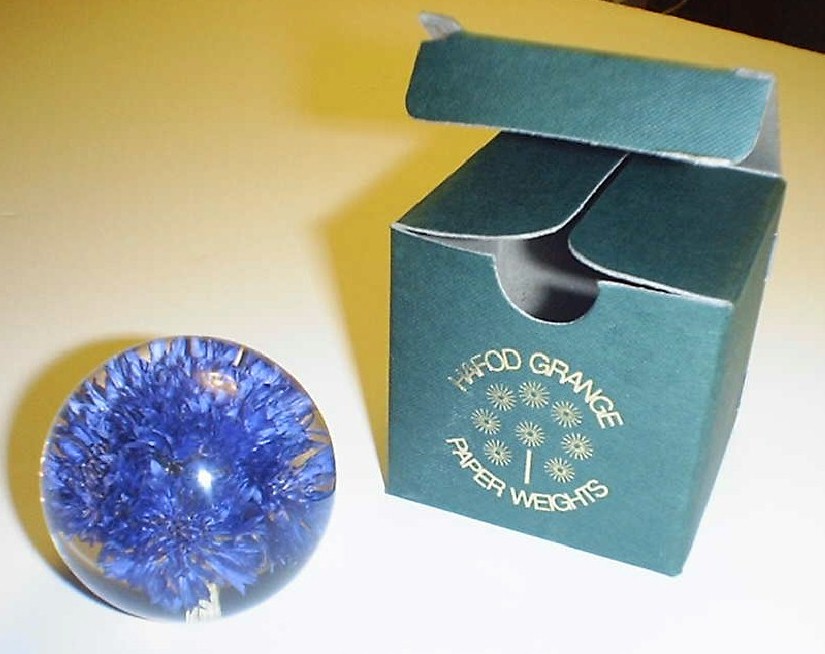 This beautiful paperweight features a real cobalt-blue cornflower, also known as bachelor's button, preserved forever in a solid clear acrylic (looks like glass) round paperweight with a flat bottom.Imported from Great Britain, this handsome paperweight was made by "Haford Grange Paper Weights" and measures approximately 2 1/2" in diameter.Each paperweight comes in an attractive dark-green gift box with gold lettering. Manufacturer's suggested retail price is $50.00 - on sale for $20 - You save $30!