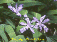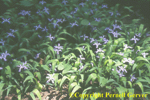 cristata: 4-6", This native iris is a fine addition to the spring woodland wildflower garden. It's a small iris that creeps along by shallow, underground rhizomes to form large clumps. Each plant bears one to two flowers on a single flower stem two to three inches tall. Flowers are pale blue. When in full bloom in mid spring, a mature colony carpets the woodland floor with a sea of blue. Blooms alongside and combines nicely with yellow lady's slipper orchid. A live plant in a 3" pot - $12 each or 3 for $34.20 - You save $1.80! (Nursery-propagated, not wild-collected)