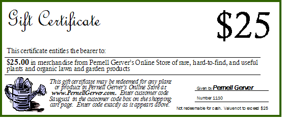 Online Store Categories: Fungicides/Disease Control Pest Controls/Animal Repellents Weed Preventer Weed Killer Winter Protection Lawn Care Organic Gardening Flower Gardening Vegetable & Fruit Gardening Container Gardening Household Soil Testing Seed Starting Hand Tools Planting Tools Composting Pruning Watering/Water Sensors Propagation Gloves Gardener's Journal Fertilizers/Plant Food Hydrogels Seed Starting Supplies Marker & Labels Soil Mixes Perennials Containers & Plants for Containers House Plants Wildflowers Bulbs Annuals Shrubs Herbs Trees Roses Vines Dried Flower Creations Souvenir Items Preserving Flowers Gifts for Gardeners Gift Certificates Special Orders Index of Plants and Gardening Products |