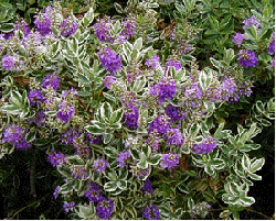 Hebe 'Variegata' - to 4', This attractive shrubby house plant has elliptical leaves held opposite one another all up and down its stiff stems. The olive-green leaves are edged with creamy white, creating a stunning contrast. Clusters of purple flowers bloom at the tips of its stems. A live plant in a 3" pot - $15 each or 3 for $42.75 - You save 2.25!