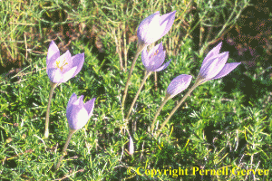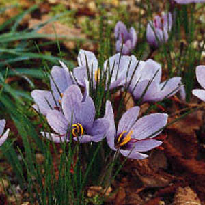 Saffron Crocus (sun to part shade) : 4", Saffron is the world's most expensive spice, but did you know it is derived from a fall-blooming crocus? Saffron crocus bears the bright-orange stigmata that is the source of saffron. As a matter of fact, you can grow your own saffron. When the blooms open pick off the stigmata and dry them or throw a few in a pot of rice for seasoning and coloring. In the garden, saffron crocus begins blooming in mid autumn and is colorful for weeks. The flowers are true blue with three, bright-orange, very-long stigmas. The flowers are about four inches tall and bloom at the same time the foliage is present. (three bulbs per each) - $8 each or 3 for $22.80 - You save $1.20!
