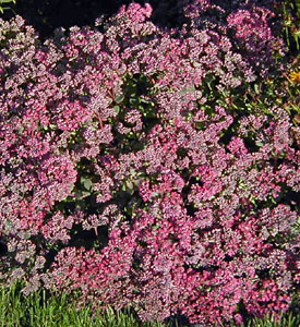 'Ruby Glow' - to 8", This spreading sedum combines unique foliage and striking flowers. Its small, rounded foliage has a blue-purple blush and is carried on red stems. Clusters of ruby-red flowers begin blooming in midsummer and continue blooming into early autumn, providing an exceptionally long season of bloom. It grows to eight inches high with the flowers and spreads to form a handsome carpet of flowers and foliage. A live plant in a 3" pot - $15 each or 3 for $42.75 - You save $2.25!