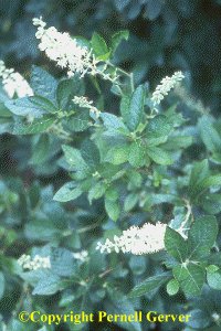 alnifolia 'Hummingbird': to 3 ½ feet, One of the best shrubs for summertime bloom. It bears spikes of creamy-white flowers with a wonderful sweet fragrance that really perfumes the garden. The flowers appear in midsummer and continue blooming for up to six weeks. This compact variety fits well in any garden or landscape. The deep, glossy-green foliage turns a brilliant golden yellow in autumn. A live plant in a 3" pot - $25 each or 3 for $71.25 - You save 3.75!